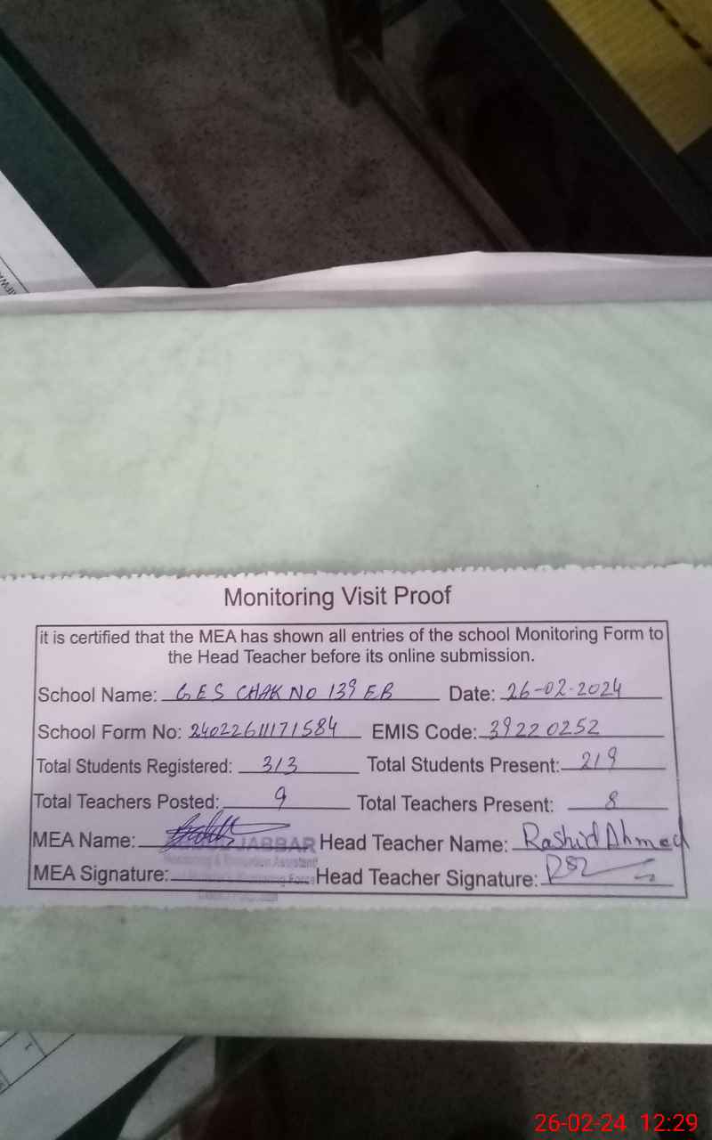 | EMIS Code: 39220252 | Name of School: GES CHAK NO 139 EB | |||