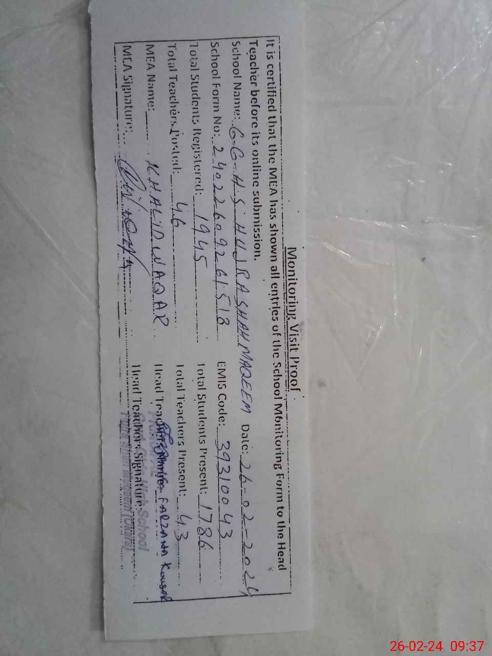| Certified that this School was Inspected by the Undersigned MEA/DMO Today and the Information Stated Above is as Per Record. | |||||