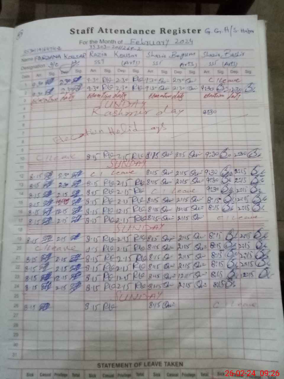 | Leave | Duty | Absent | Maternity | Medical | Ex- Pak |