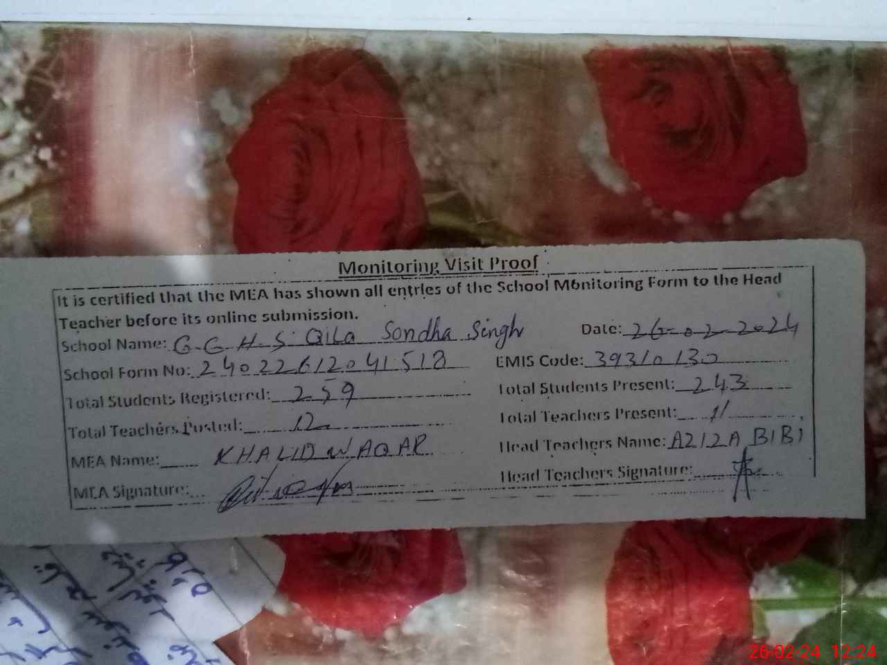 | Attendance Register | Head Teacher | MEA with School | Visit Proof |