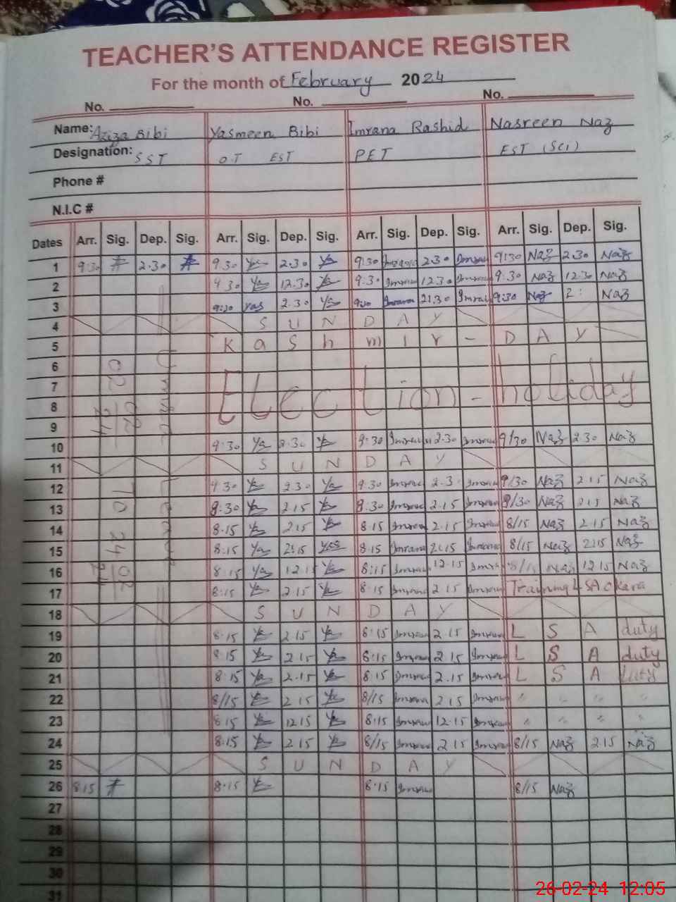 | CNIC | Full Name | Designation | R/C | Absence During Last Calender Month |