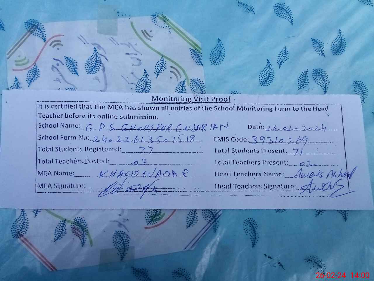 | EMIS Code: 39310269 | Name of School: GPS GHOUS PUR GUJJRAN (GHATTAY PHAKNI) | |||