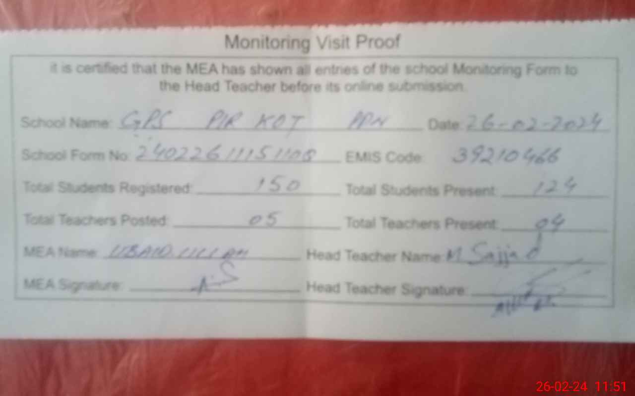 | EMIS Code: 39210466 | Name of School: GPS PIR KOT PAKPATTAN | |||