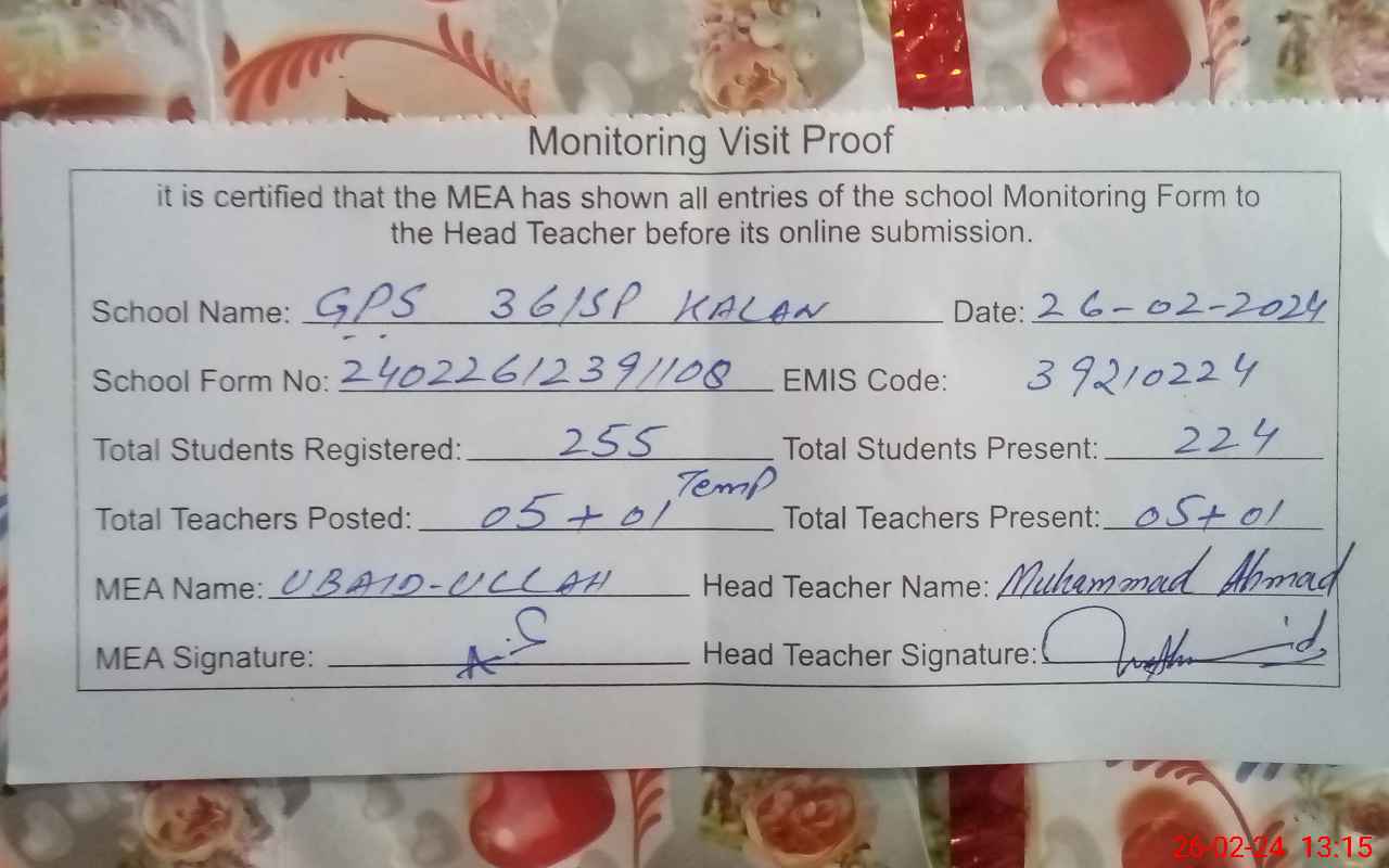 | EMIS Code: 39210224 | Name of School: GPS CHAK NO. 36 SP KALAN | |||