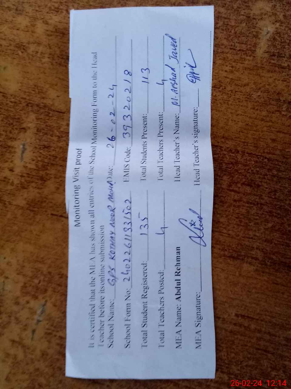 | Attendance Register | Head Teacher | MEA with School | Visit Proof |