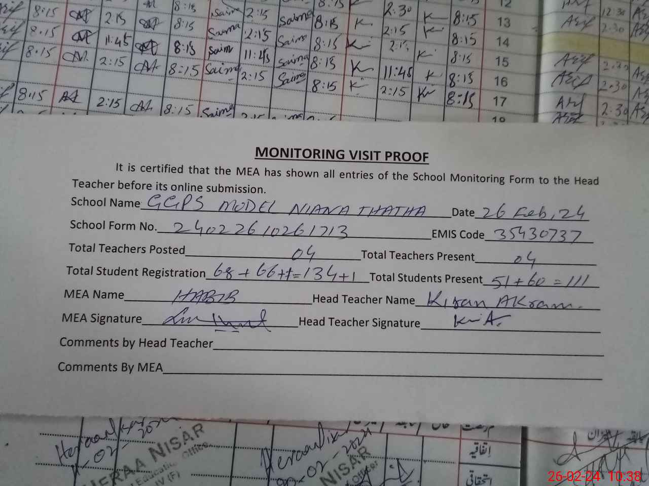 | Monitoring Date: 26-02-2024 | Start Time: 26-02-2024 09:59 AM | End Time: 26-02-2024 10:40 AM | Name of MEA: Mu**** Ha**** | |