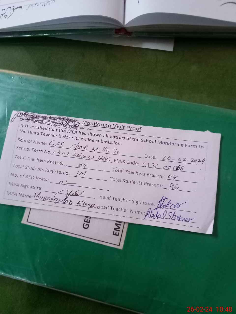 | Attendance Register | Head Teacher | MEA with School | Visit Proof |