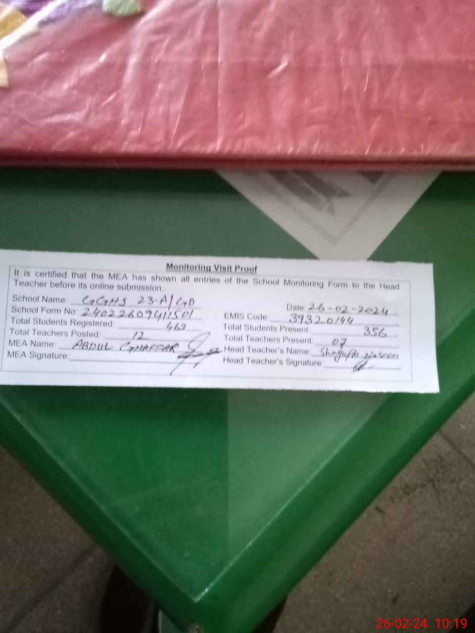 | Certified that this School was Inspected by the Undersigned MEA/DMO Today and the Information Stated Above is as Per Record. | |||||