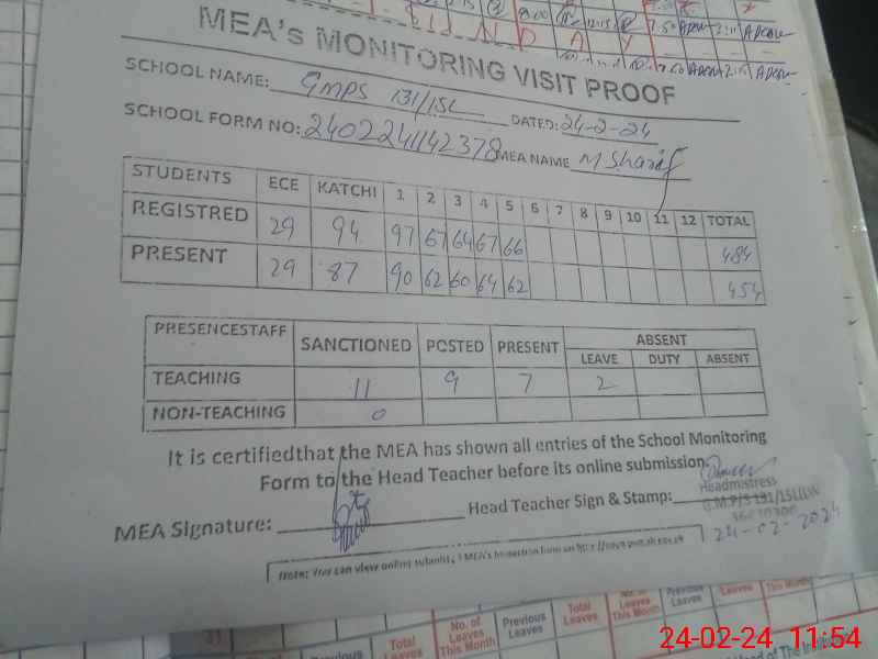 | Attendance Register | Head Teacher | MEA with School | Visit Proof |