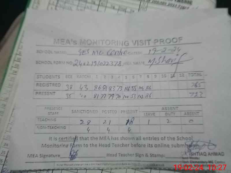 | Attendance Register | Head Teacher | MEA with School | Visit Proof |