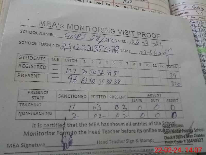 | Certified that this School was Inspected by the Undersigned MEA/DMO Today and the Information Stated Above is as Per Record. | |||||