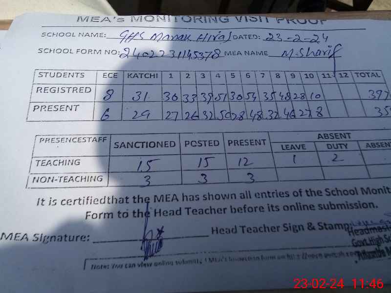 | EMIS Code: 36430071 | Name of School: GHS MANAK HERAJ, TULAMBA | |||