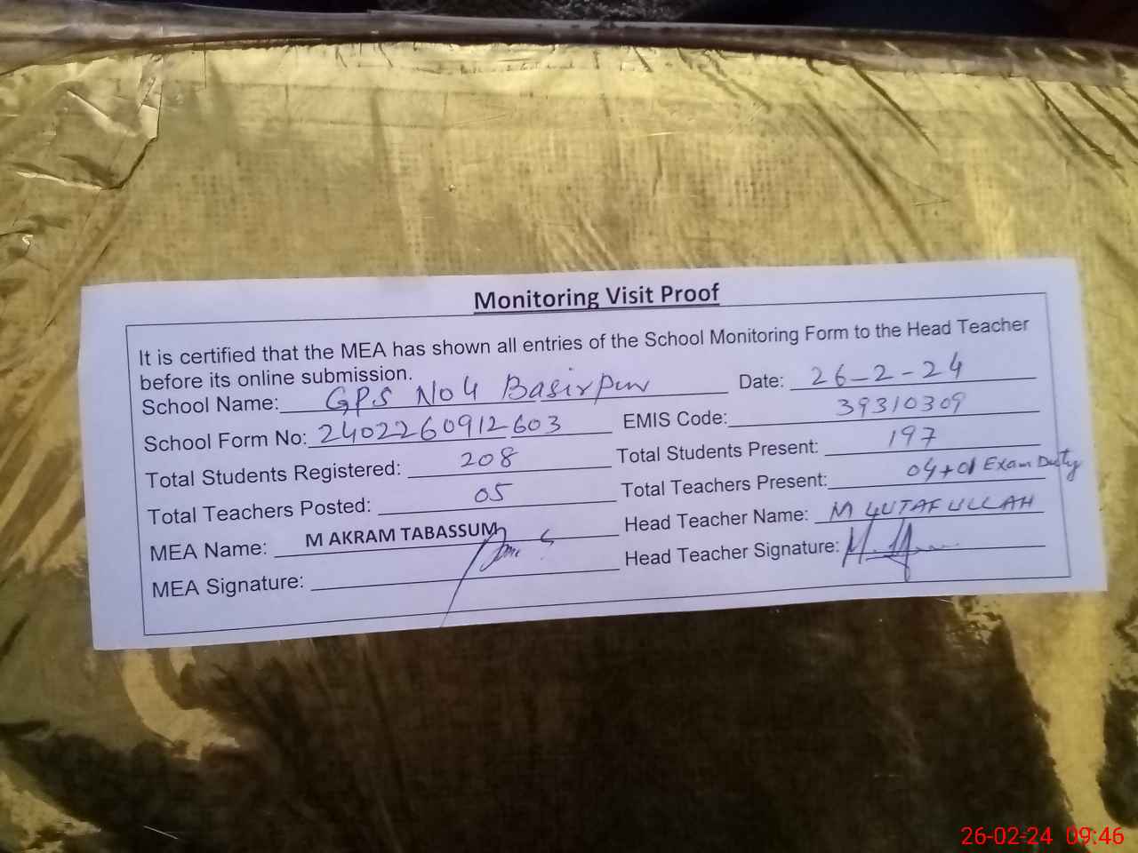 | EMIS Code: 39310309 | Name of School: GPS NO. 4 BASIR PUR | |||