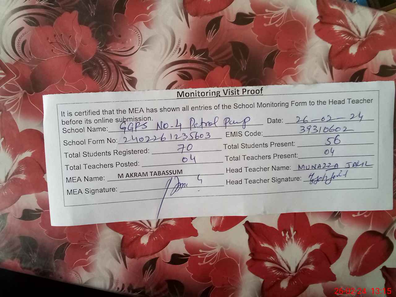 | EMIS Code: 39310602 | Name of School: GGPS NO 4 PETROL PUMP BASIR PUR | |||