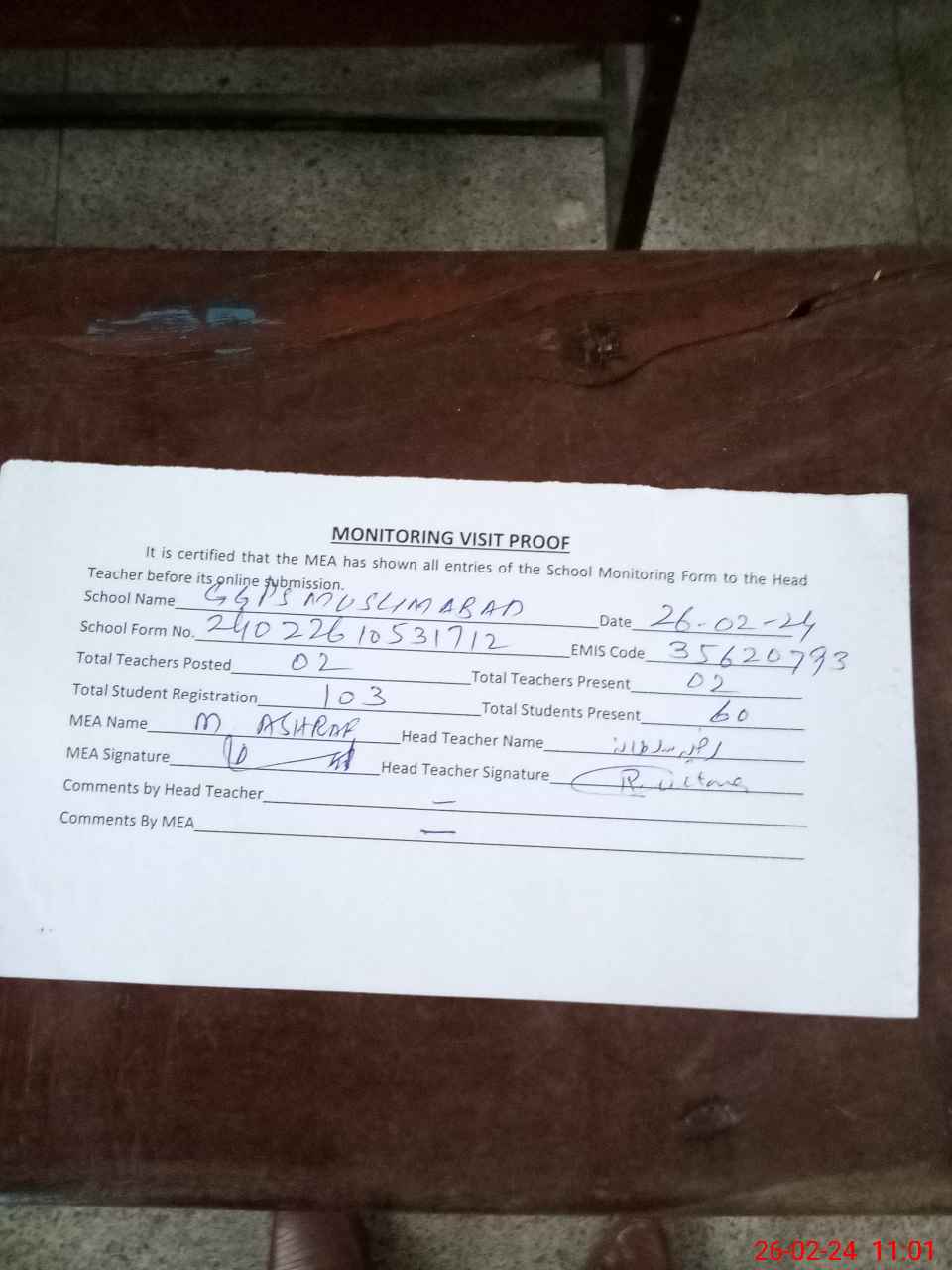 | Attendance Register | Head Teacher | MEA with School | Visit Proof |