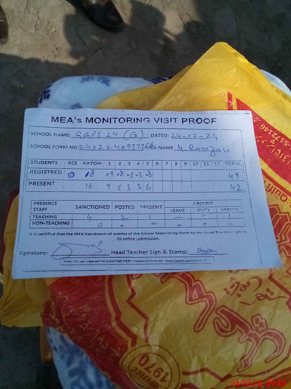 | Attendance Register | Head Teacher | MEA with School | Visit Proof |