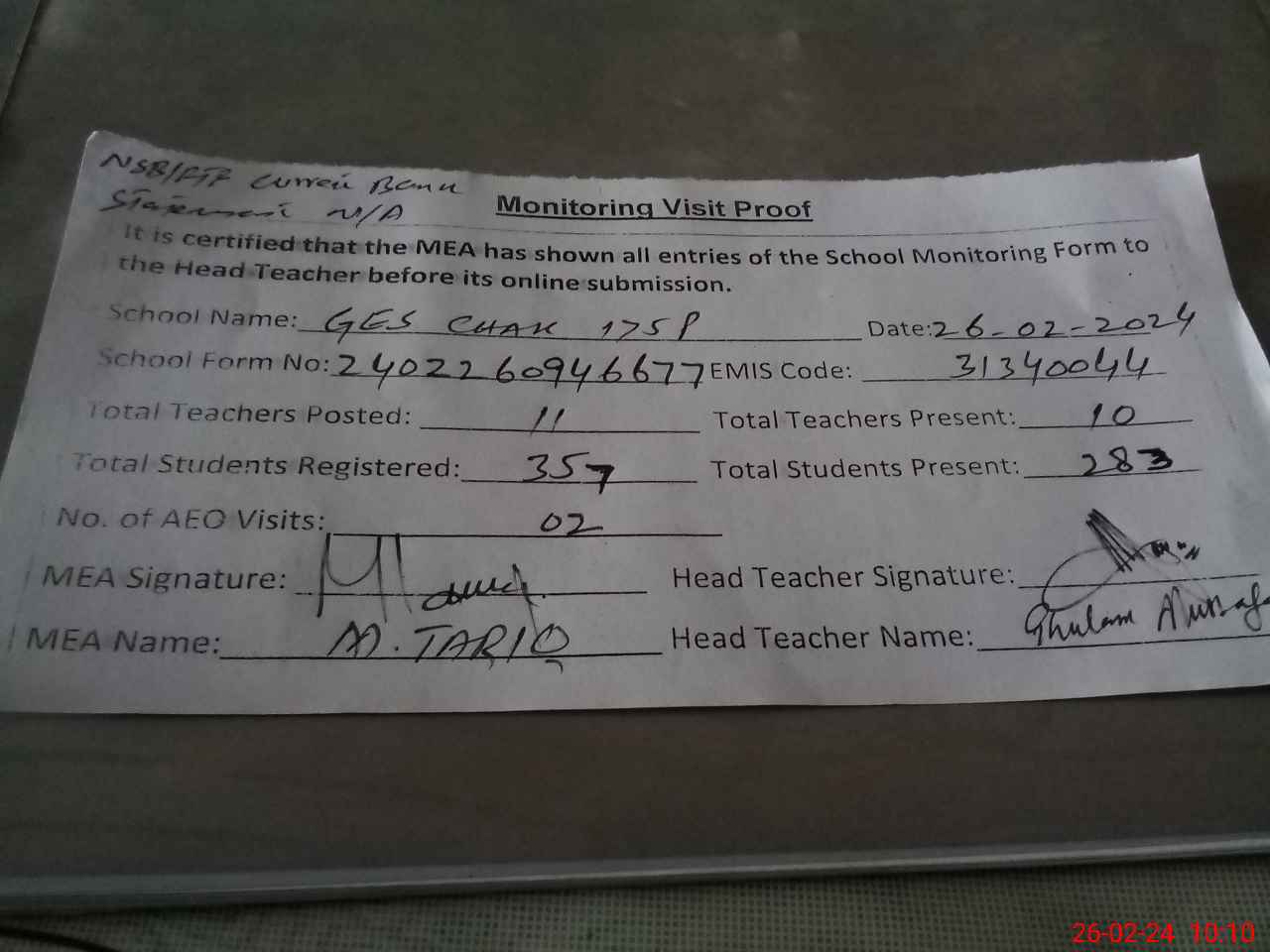 | Attendance Register | Head Teacher | MEA with School | Visit Proof |