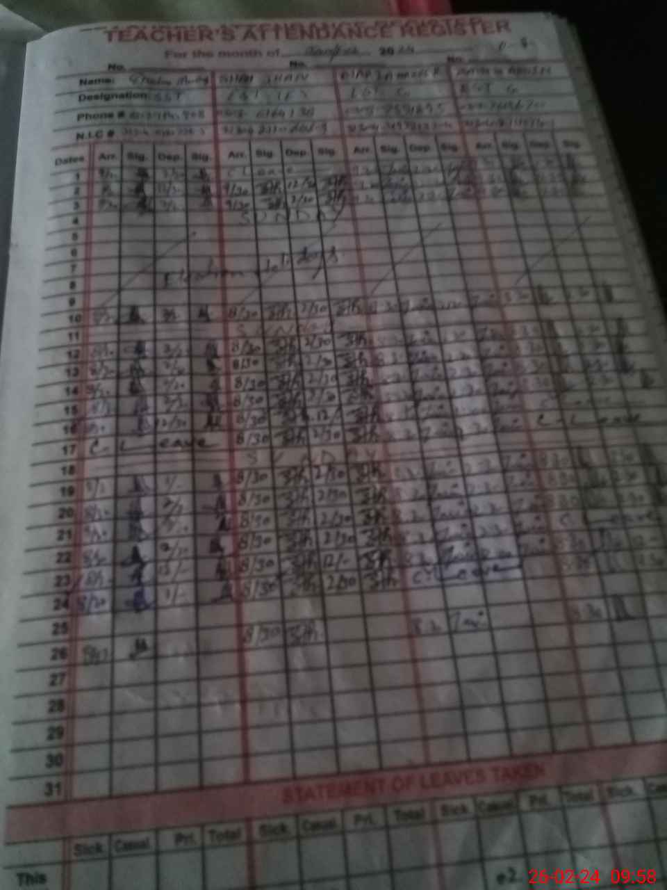 | CNIC | Full Name | Designation | R/C | Absence During Last Calender Month |