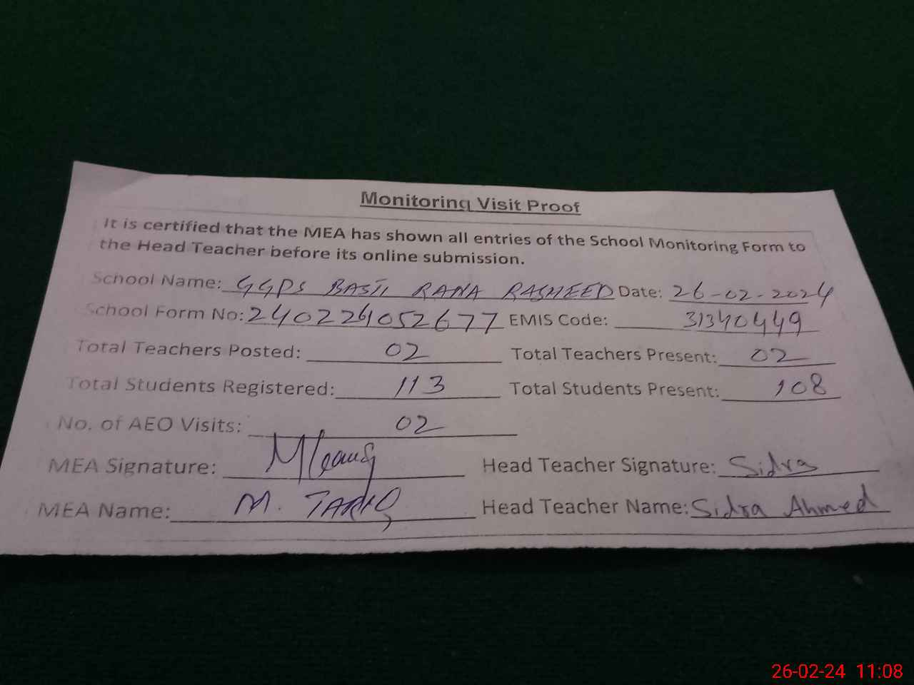 | Certified that this School was Inspected by the Undersigned MEA/DMO Today and the Information Stated Above is as Per Record. | |||||