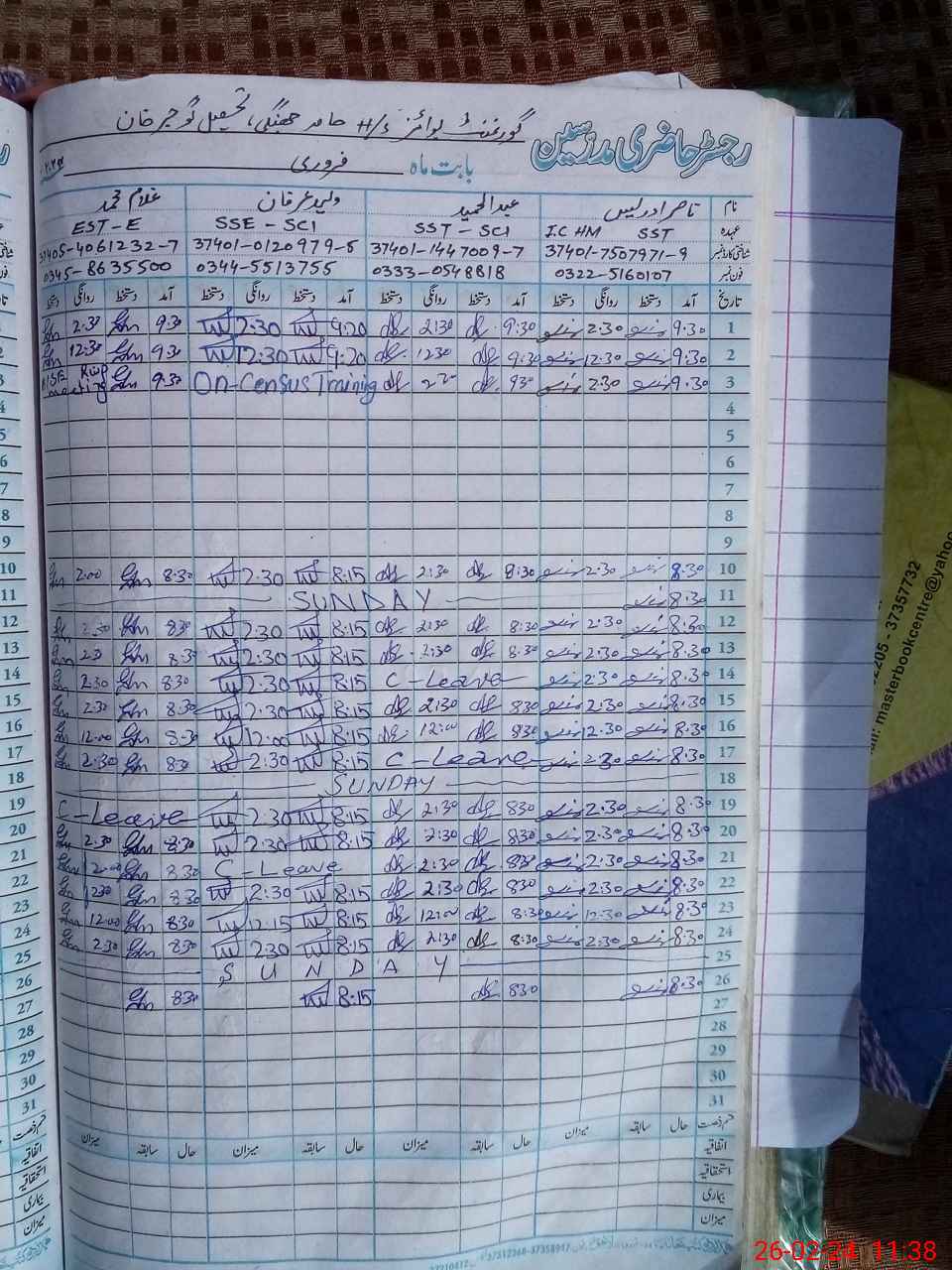 | CNIC | Full Name | Designation | R/C | Absence During Last Calender Month |