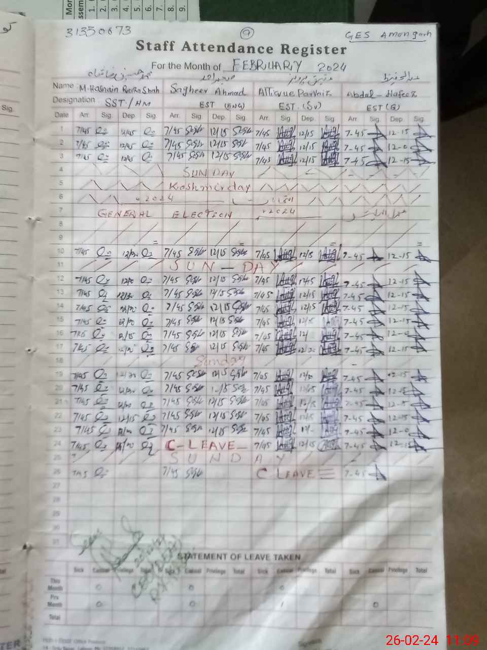 | 36**** | Na**** Pa**** | 1 | 0 | 0 | 31 | 0 | 0 | 0 | 0 | 0 | 0 | Absent (Un-Authorized) | |