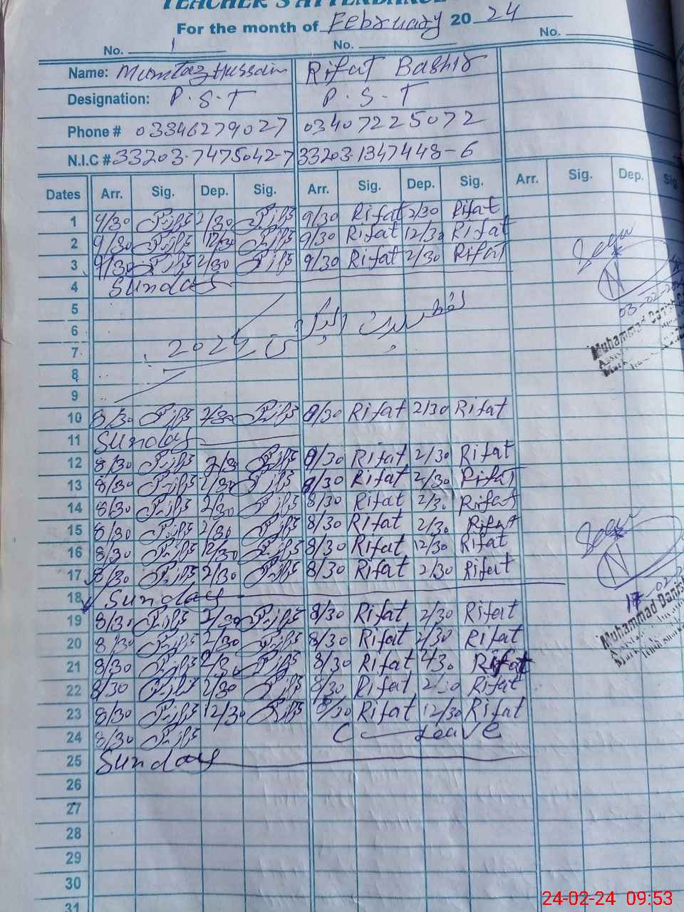| CNIC | Full Name | Designation | R/C | Absence During Last Calender Month |