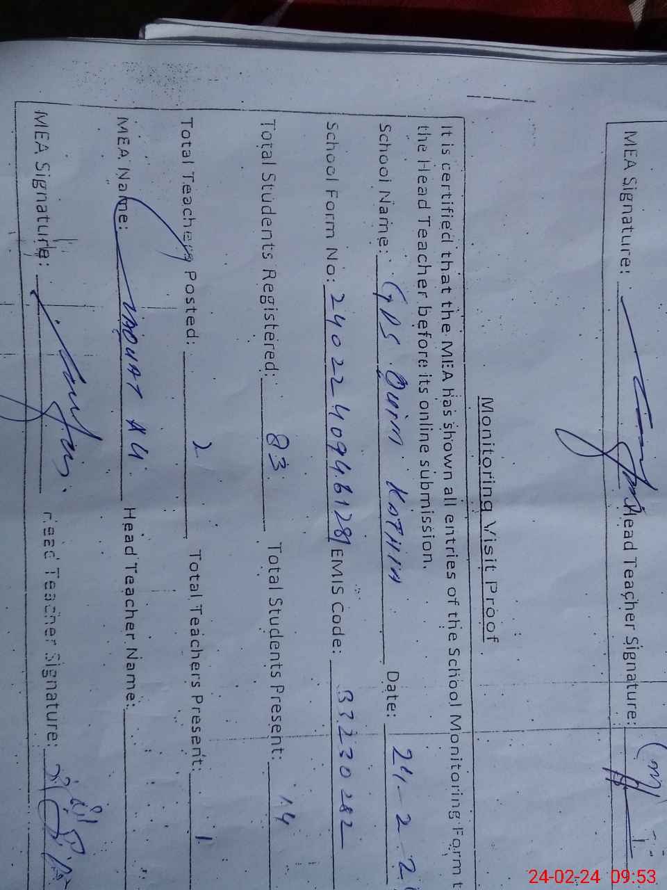 | Attendance Register | Head Teacher | MEA with School | Visit Proof |