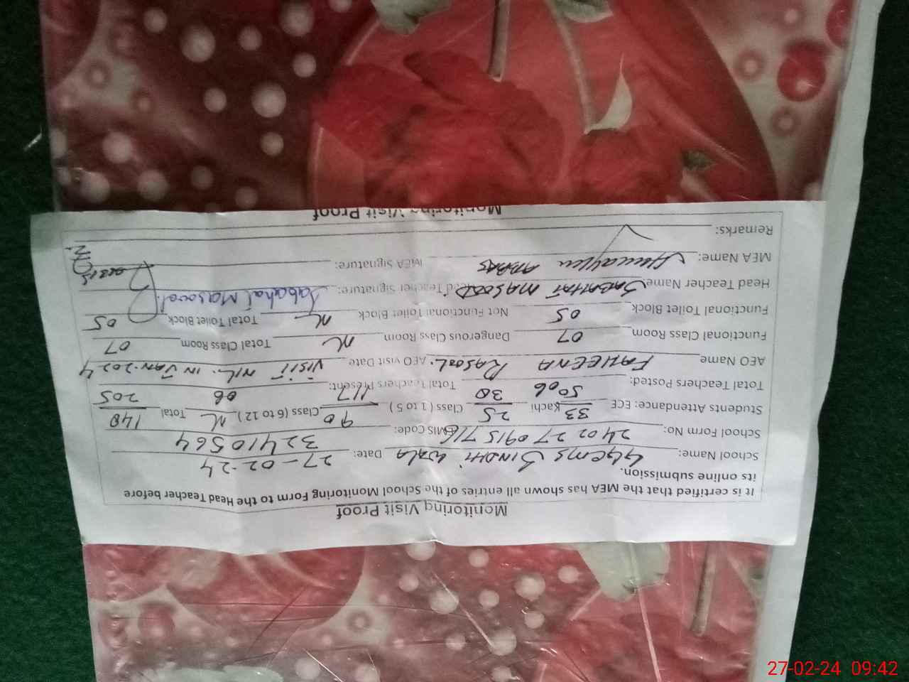 | Attendance Register | Head Teacher | MEA with School | Visit Proof |