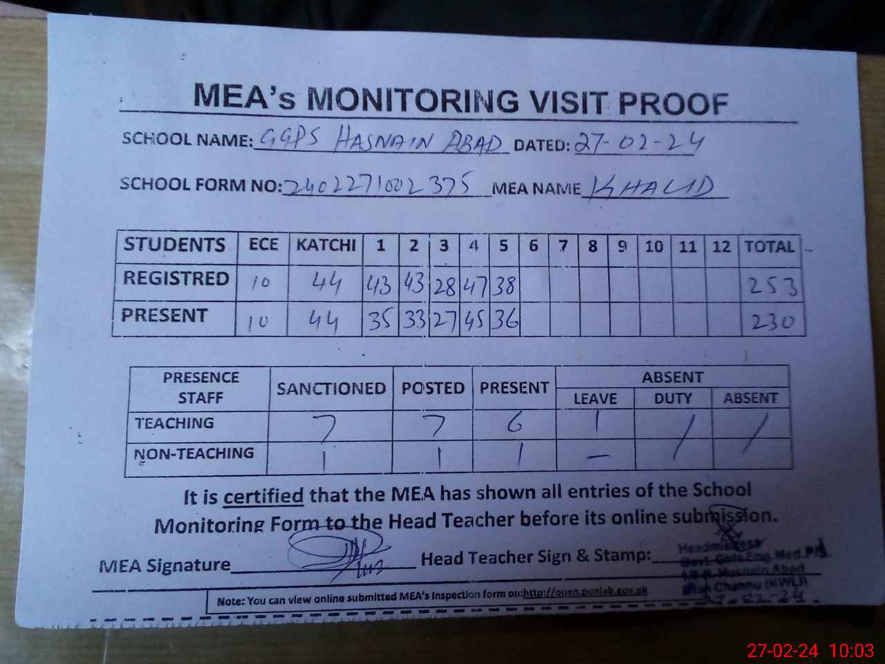 | Attendance Register | Head Teacher | MEA with School | Visit Proof |