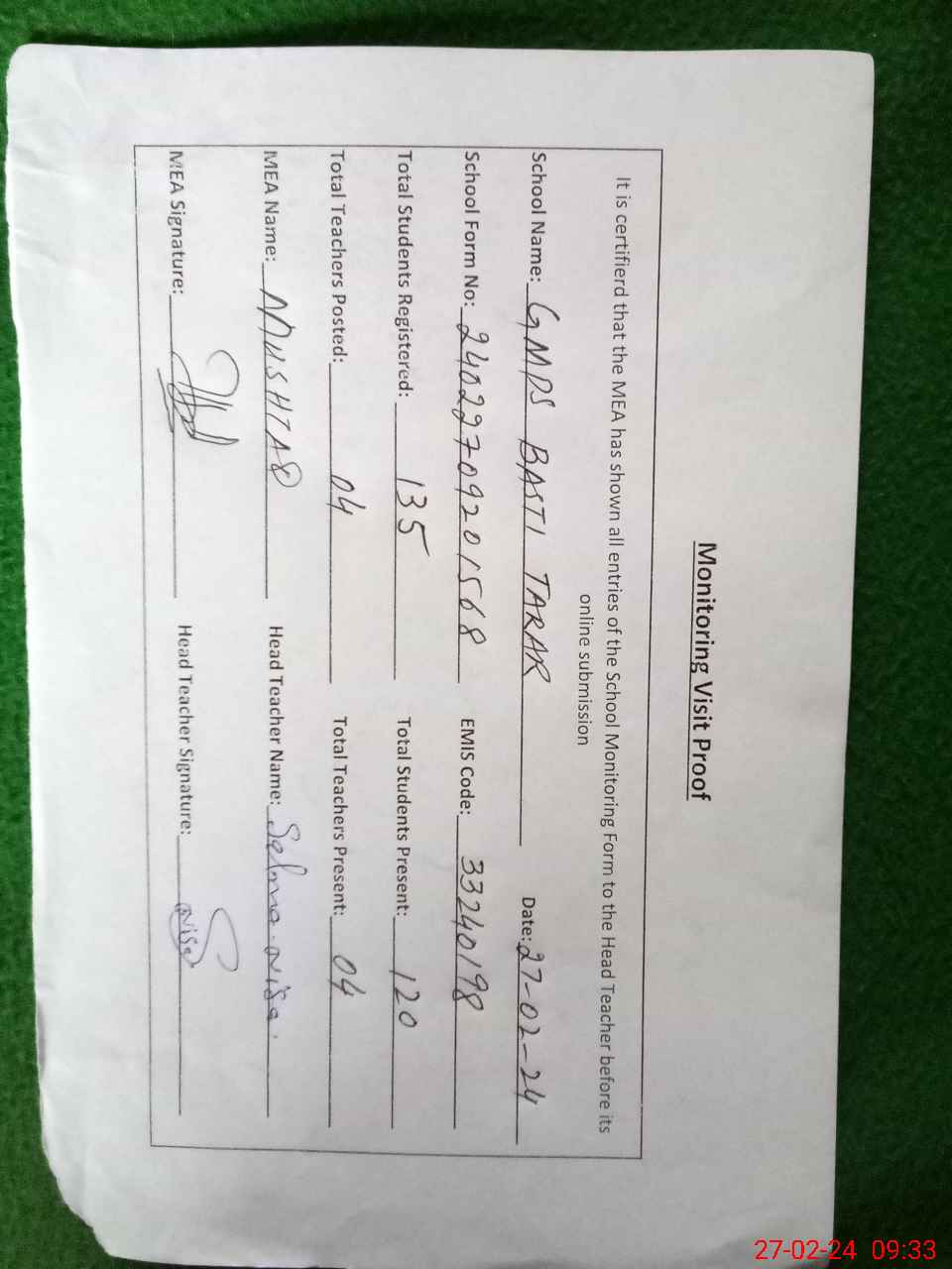 | EMIS Code: 33240198 | Name of School: GMPS BASTI TARAR | |||
