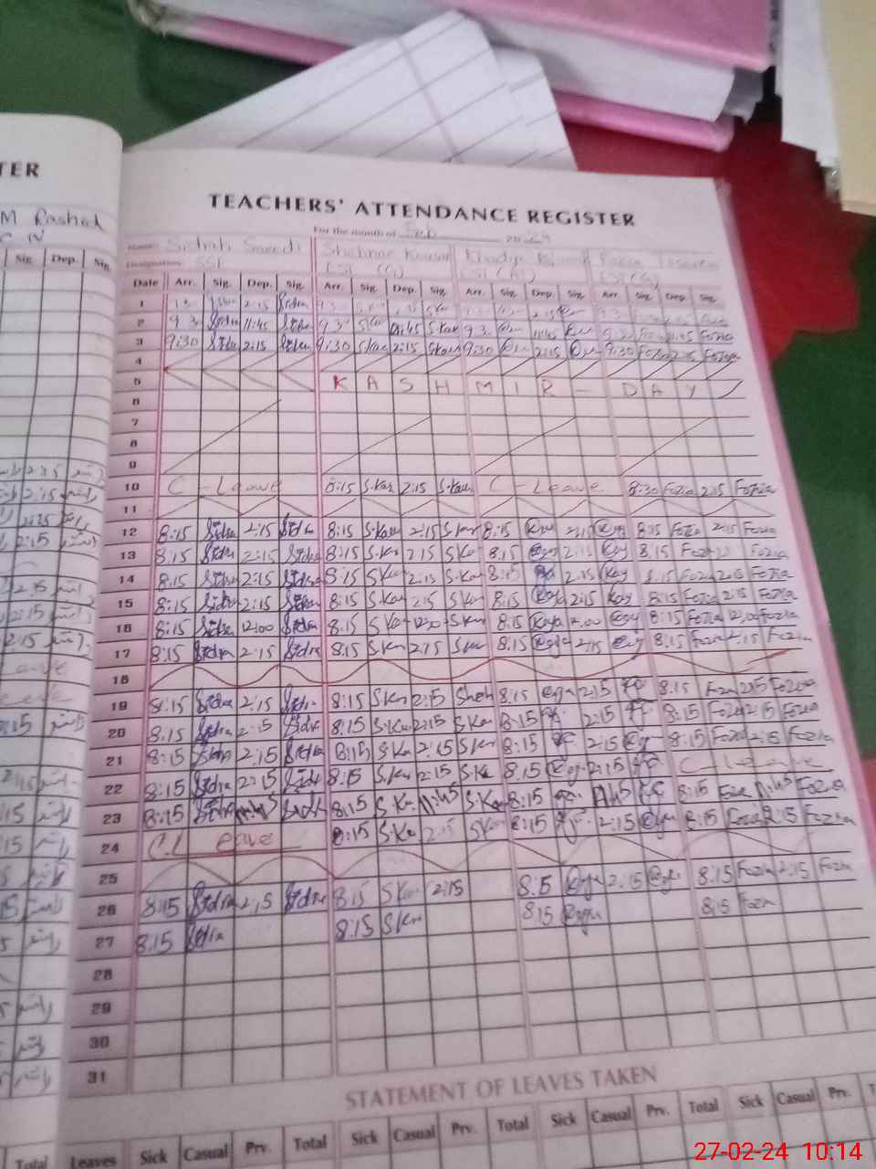 | CNIC | Full Name | Designation | R/C | Absence During Last Calender Month |
