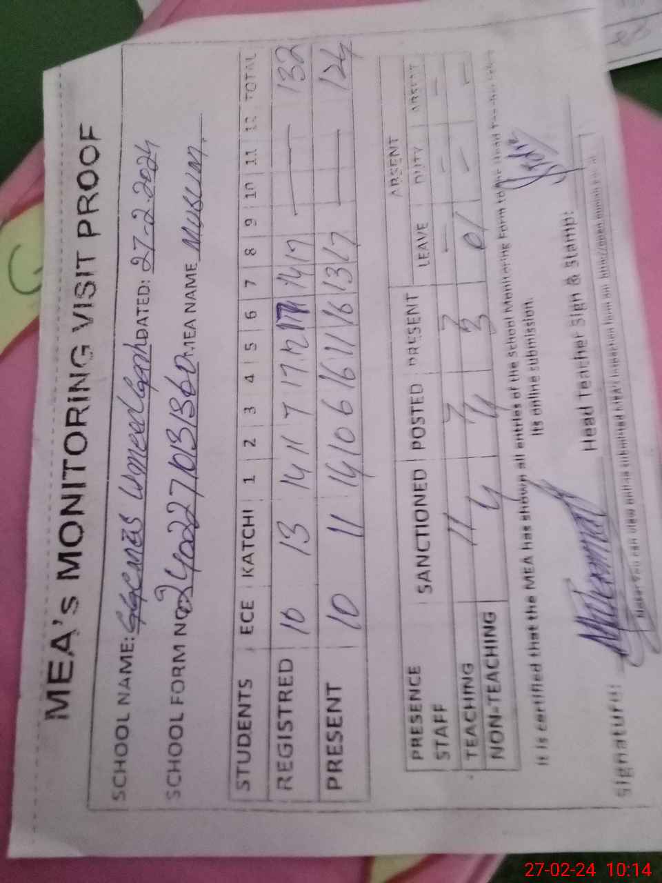 | Attendance Register | Head Teacher | MEA with School | Visit Proof |