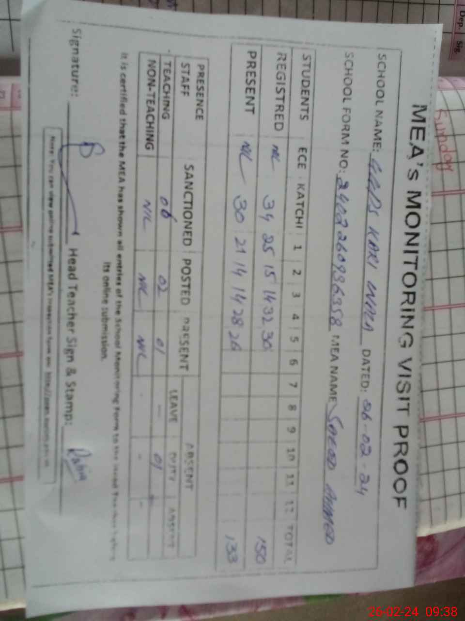 | Attendance Register | Head Teacher | MEA with School | Visit Proof |