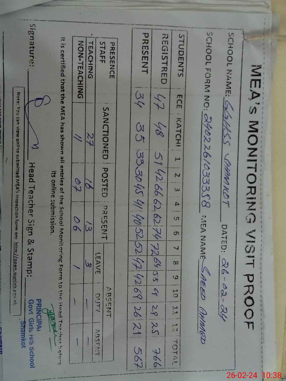 | Attendance Register | Head Teacher | MEA with School | Visit Proof |