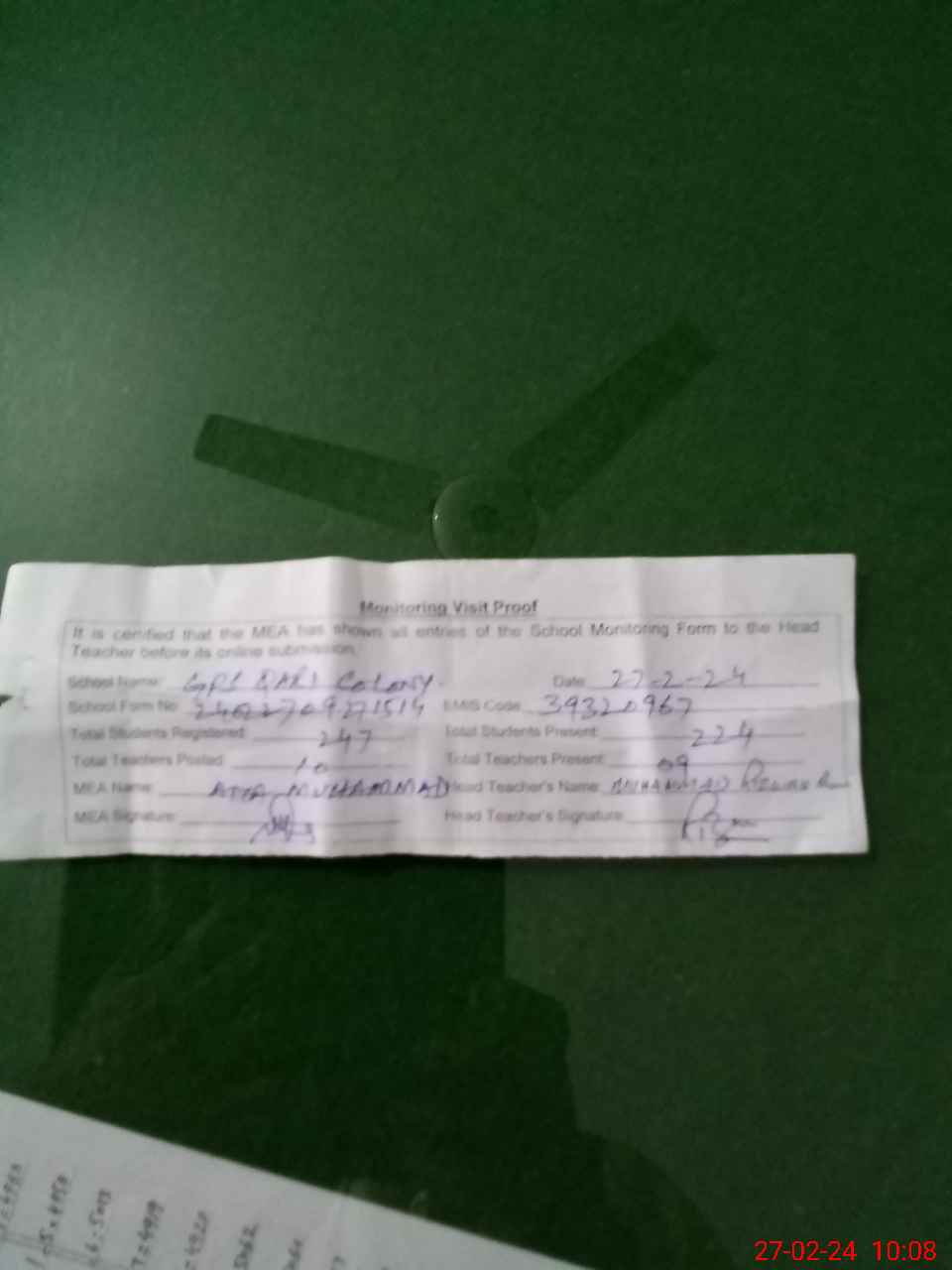 | Attendance Register | Head Teacher | MEA with School | Visit Proof |