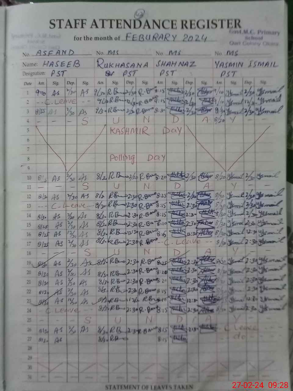 | CNIC | Full Name | Designation | R/C | Absence During Last Calender Month |