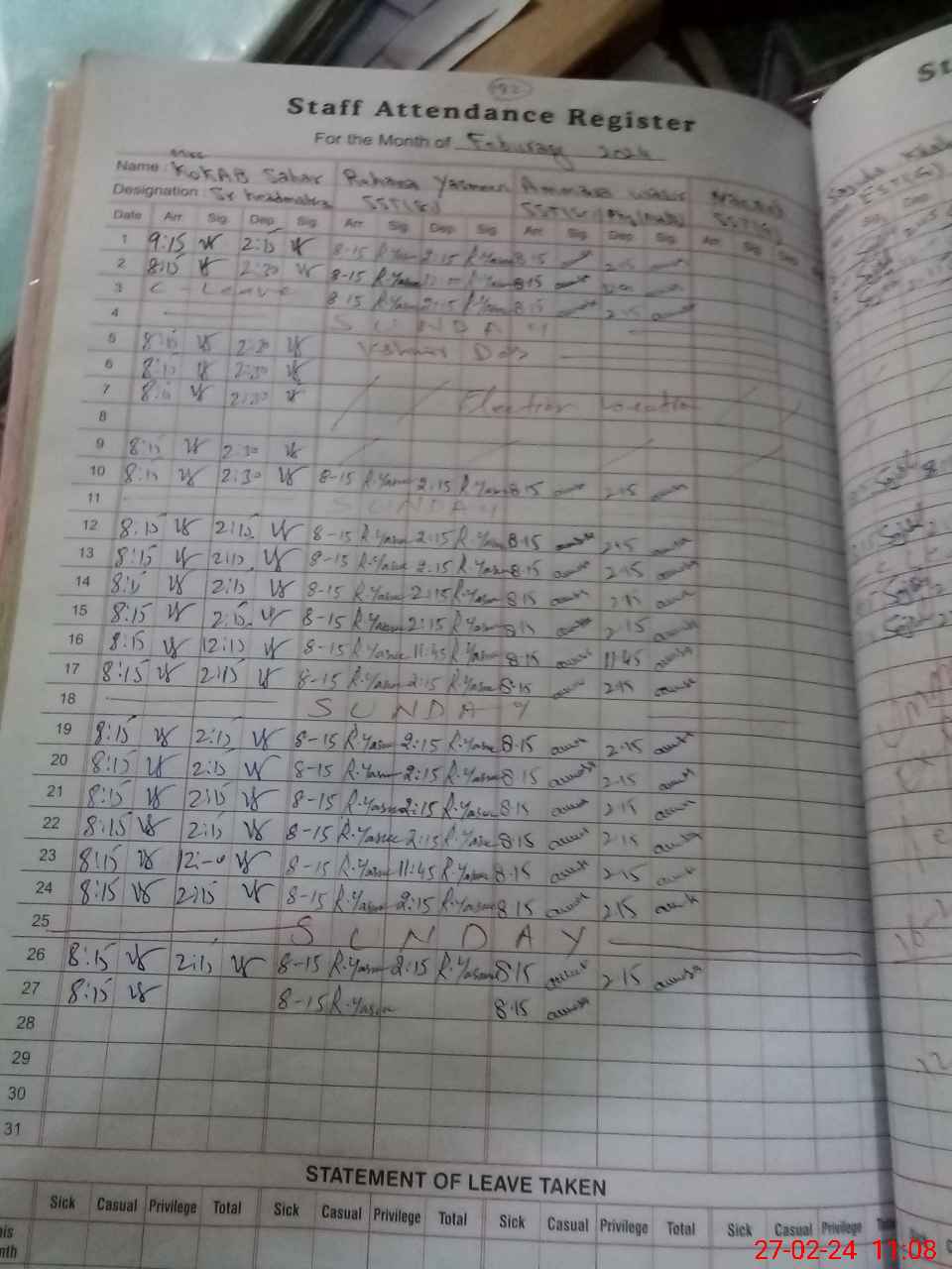 | CNIC | Full Name | Designation | R/C | Absence During Last Calender Month |
