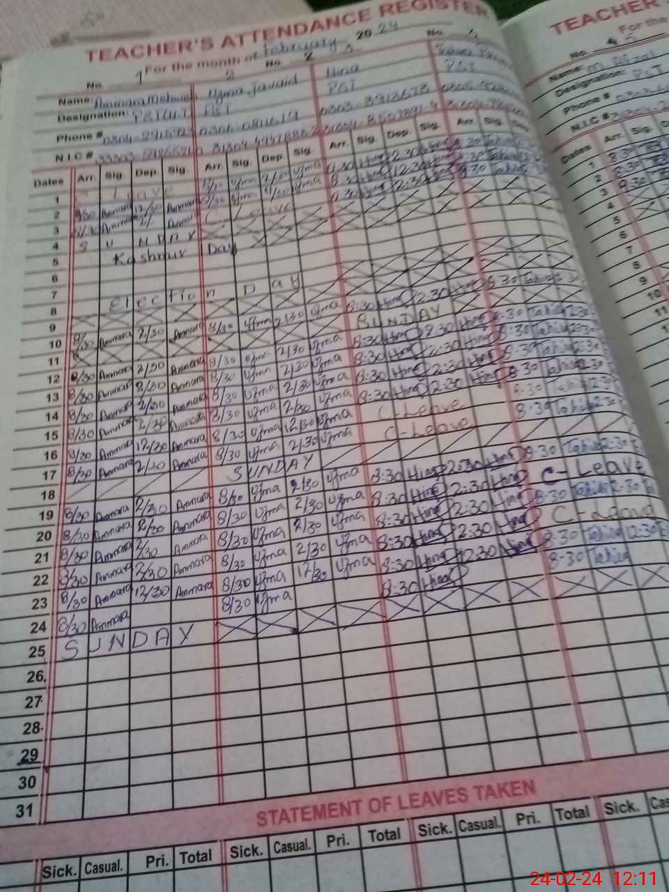 | CNIC | Full Name | Designation | R/C | Absence During Last Calender Month |