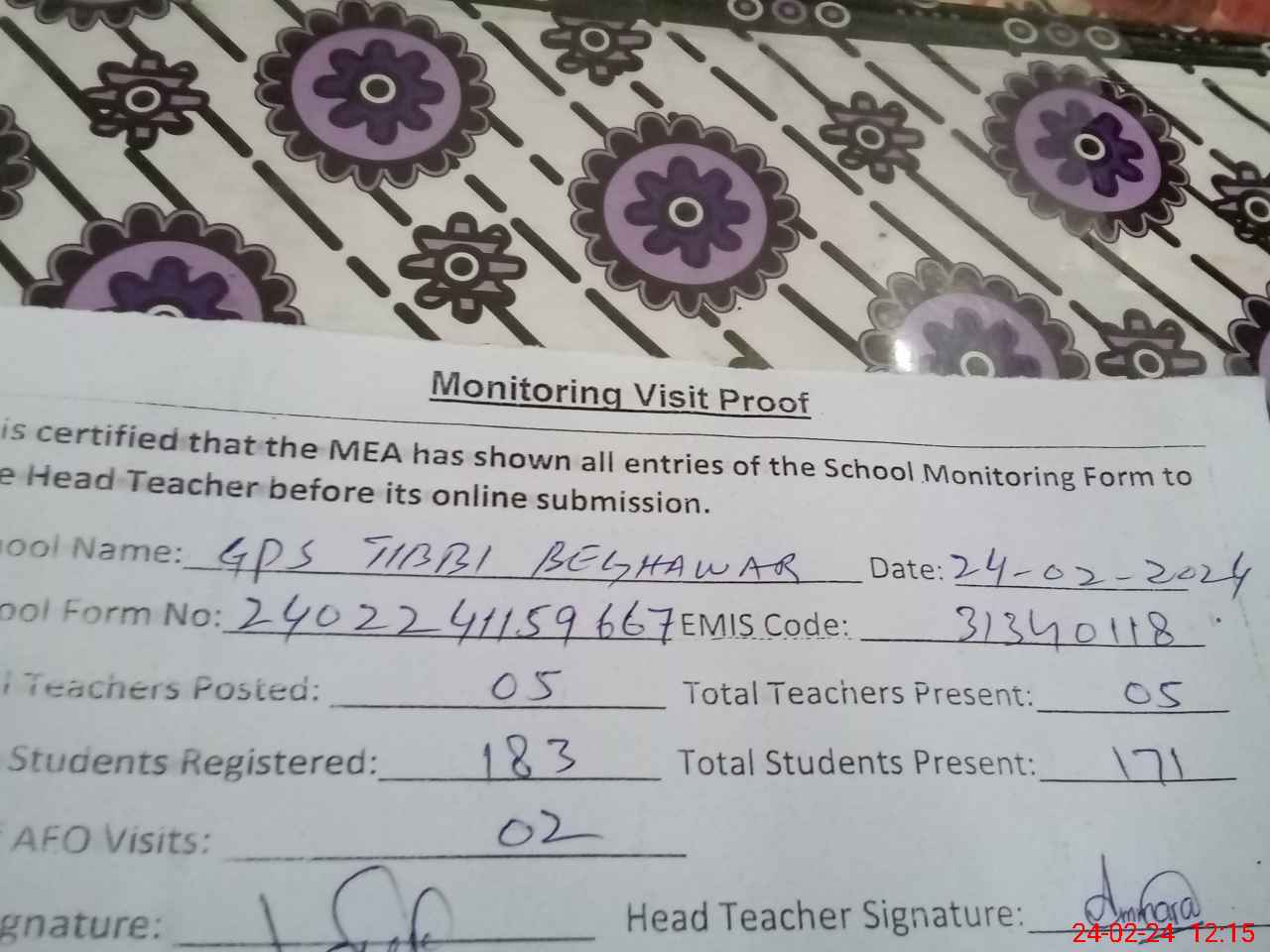 | Attendance Register | Head Teacher | MEA with School | Visit Proof |