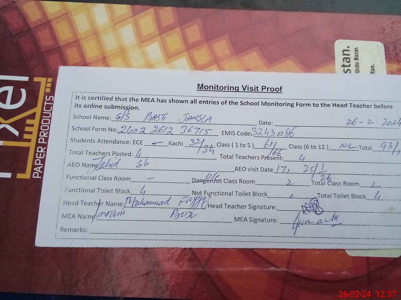 | Attendance Register | Head Teacher | MEA with School | Visit Proof |