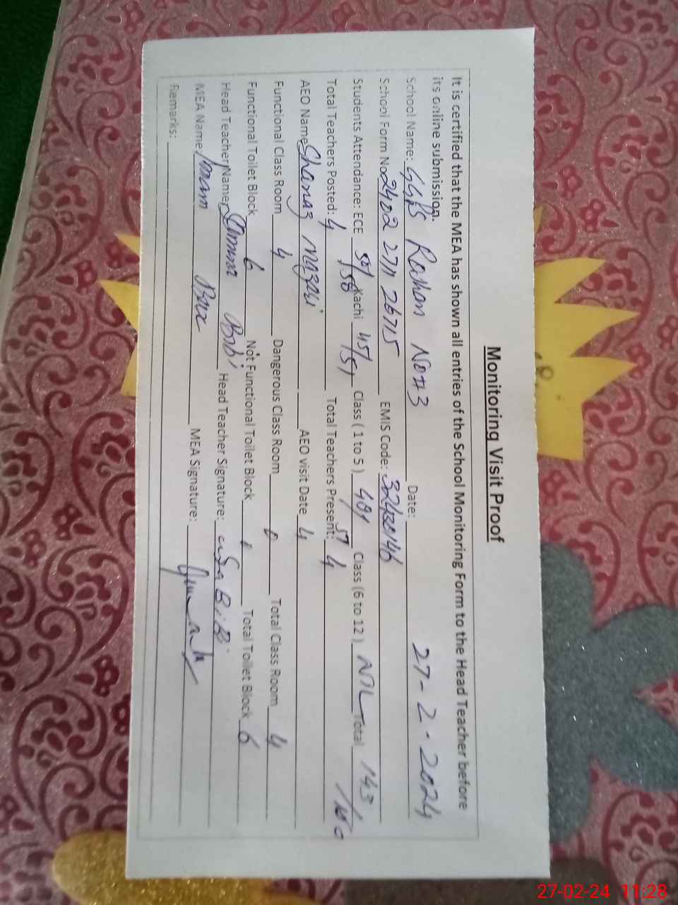 | Attendance Register | Head Teacher | MEA with School | Visit Proof |