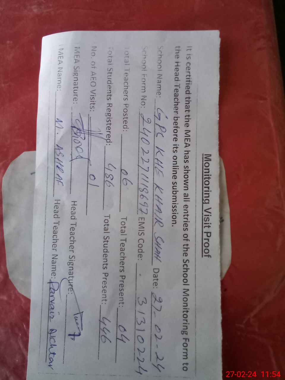| Attendance Register | Head Teacher | MEA with School | Visit Proof |