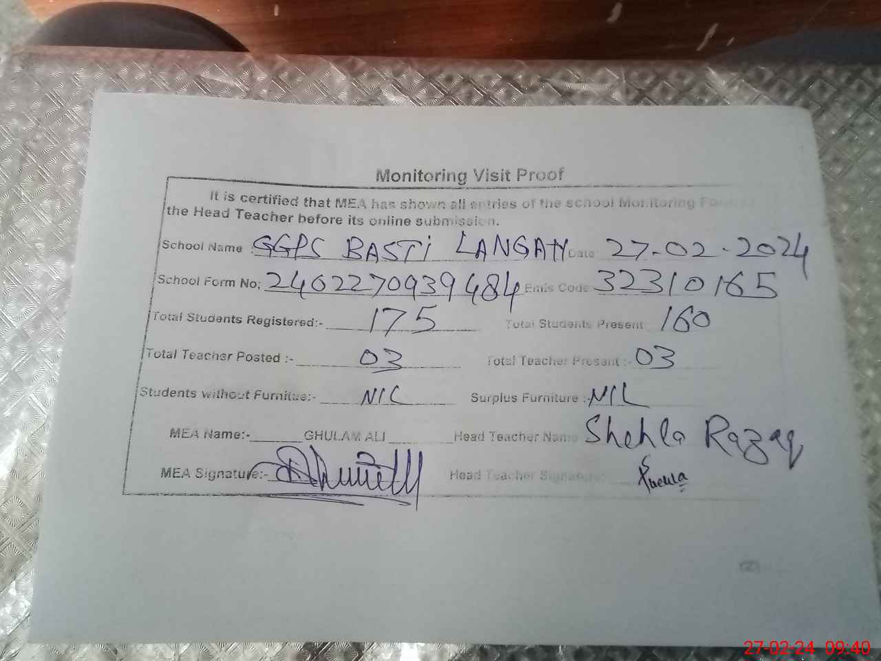 | EMIS Code: 32310165 | Name of School: GGPS BASTI LANGAH | |||