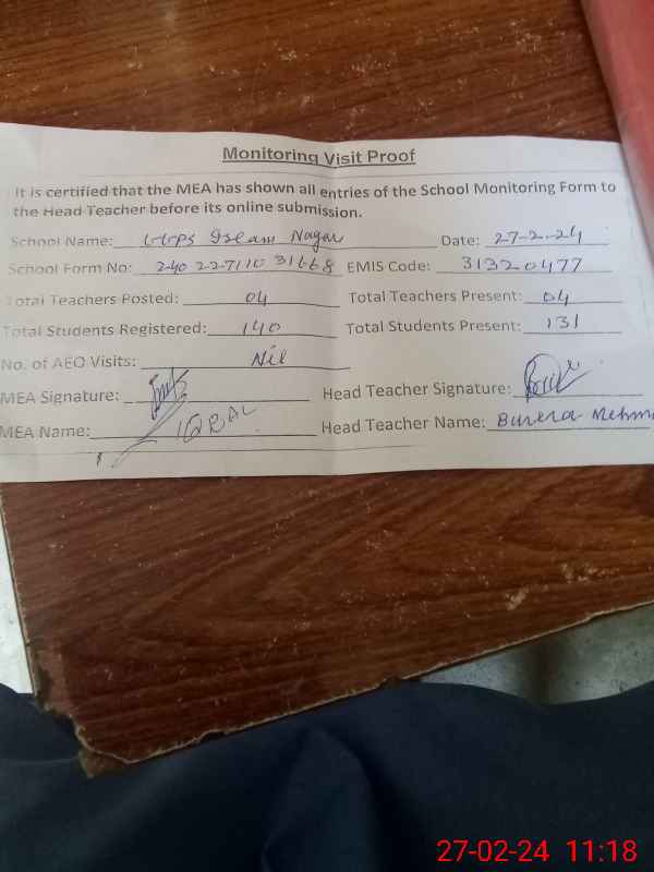 | Attendance Register | Head Teacher | MEA with School | Visit Proof |