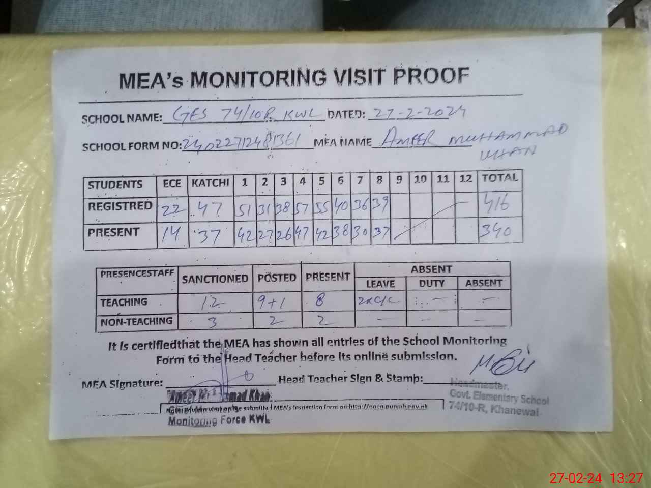 | EMIS Code: 36420064 | Name of School: GES 74/10-R, KHANEWAL | |||