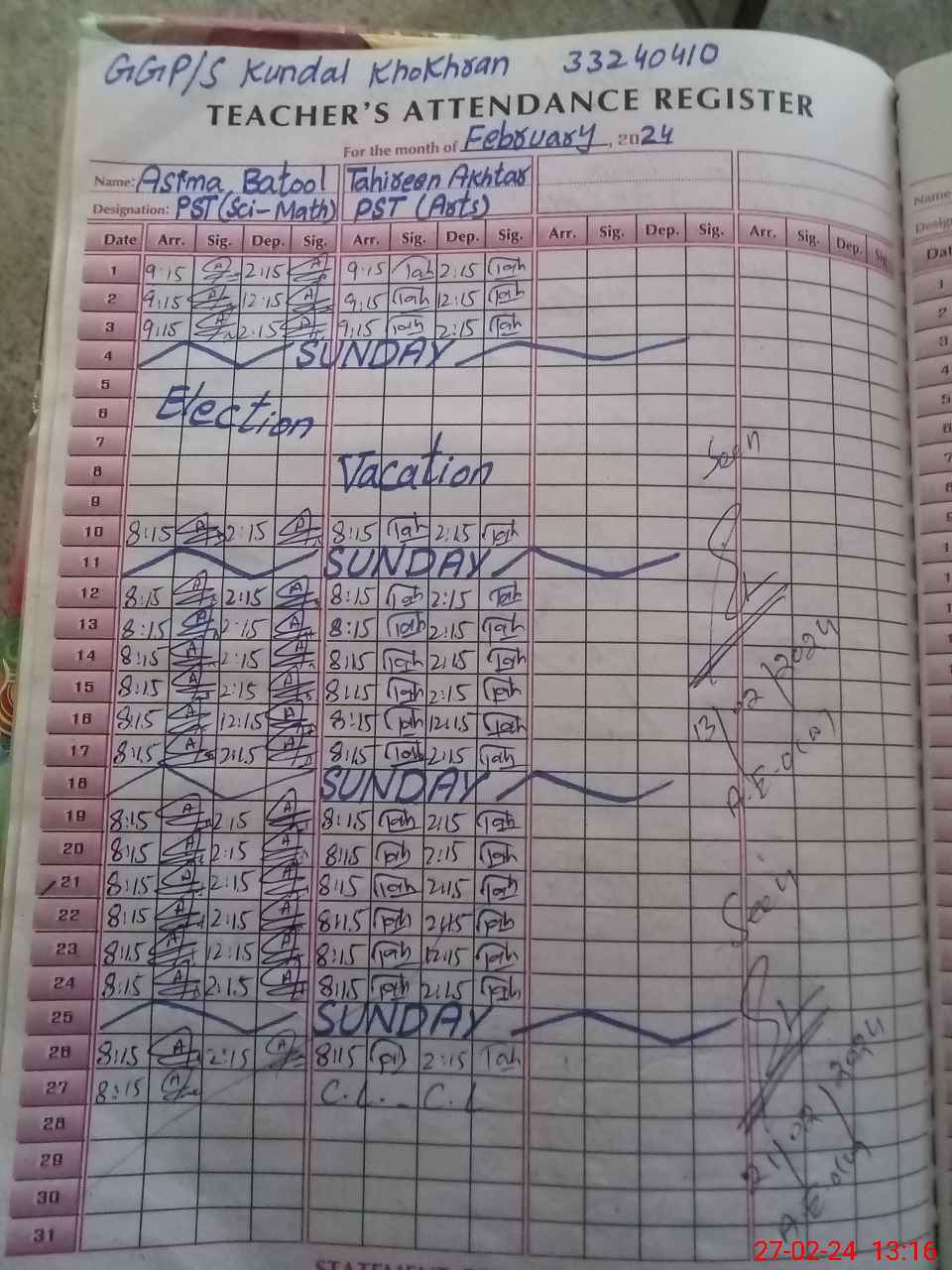 | Name: AS**** BA**** Designation: (School Headmaster's/Headmistress's) PST SC Phone/Cell Number: 03**** |