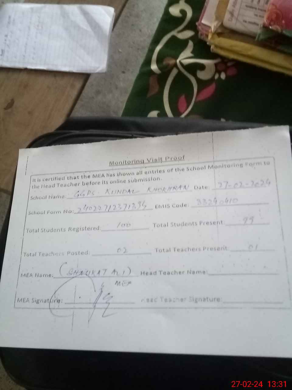 | Attendance Register | Head Teacher | MEA with School | Visit Proof |