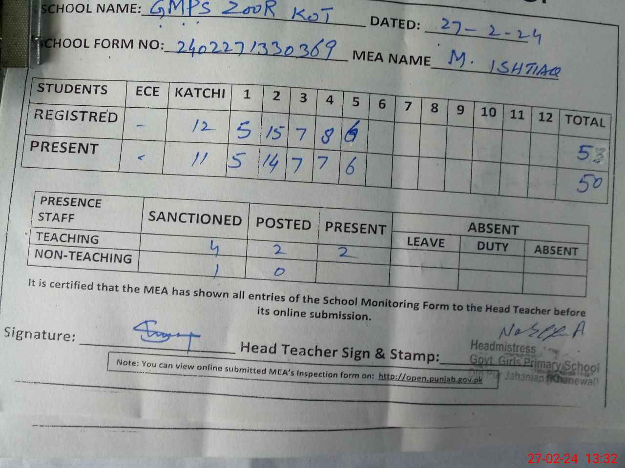 | Attendance Register | Head Teacher | MEA with School | Visit Proof |