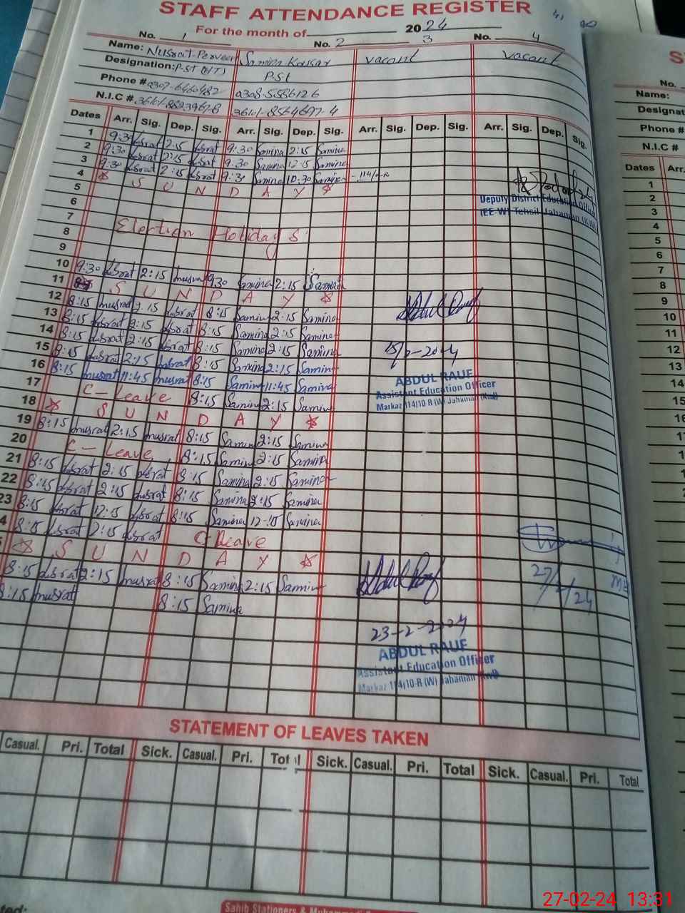 | Name: NU**** PA**** Designation: (School Headmaster's/Headmistress's) PST Phone/Cell Number: 03**** |