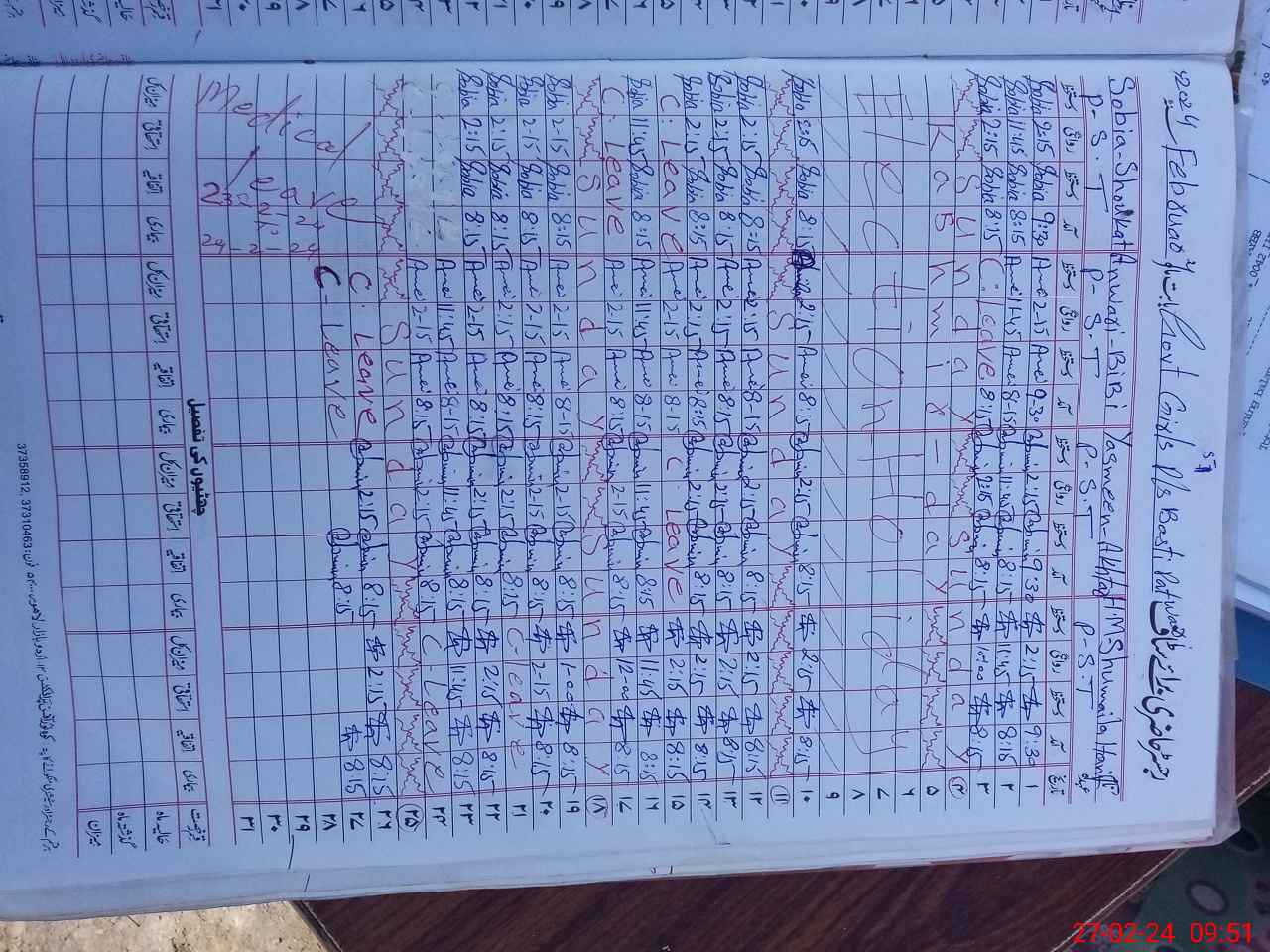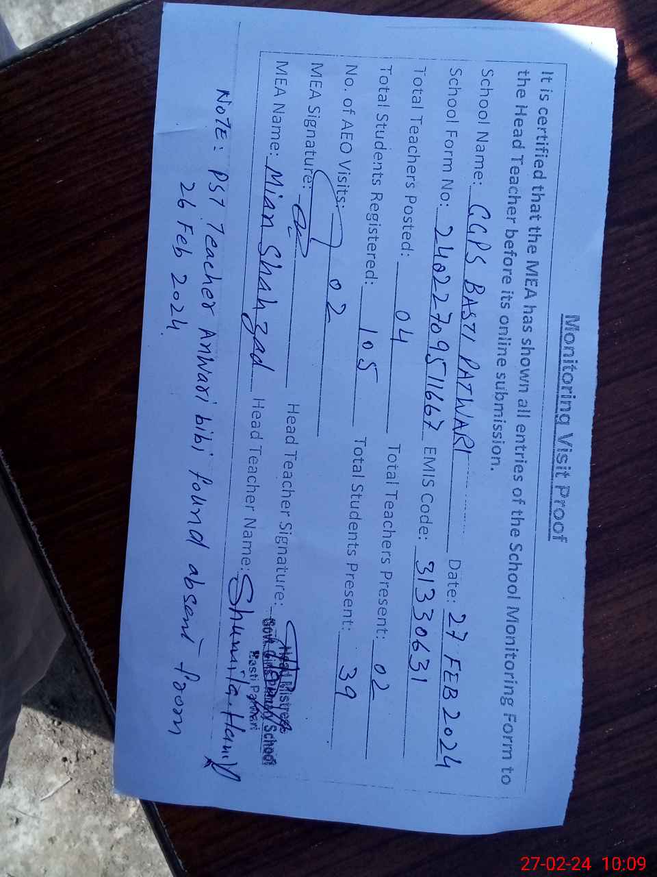 | Remarks (Use Separate Page if Required): PST teacher Anwari Bibi found absent from 26 February 2024 | |||||